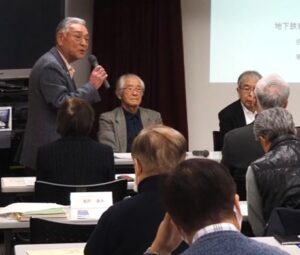 期成会の牧野会長と川島事務局長が、北野町連役員と北野地区の町内会長らに、地下鉄期成会の活動や地下鉄延伸のこれまでの経緯、最近の地下鉄延伸をめぐる状況などを説明しました。